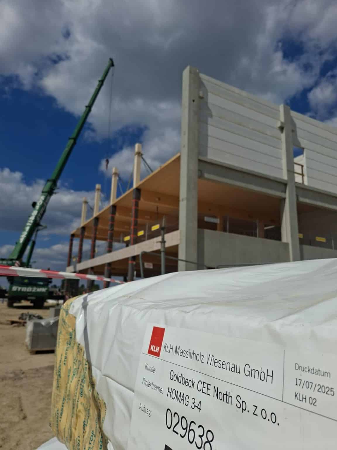 Rozpoczęliśmy dostawy CLT do budowy nowej siedziby firmy HOMAG w Środzie Wielkopolskiej. W tej chwili jest to największy budynek w technologii drewna masywnego – CLT (17 ładunków, 234 elementy, 5661 m2 CLT). Generalnym wykonawcą inwestycji jest firma GOLDBECK  Sp. z o.o., montaż konstrukcji drewnianej realizuje firma PROWOO Sp. z o.o.  Planowany termin zakończenia montażu to 31 października.